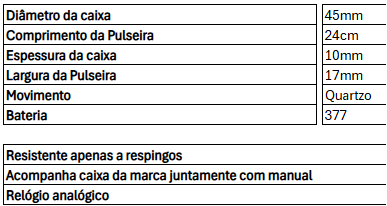 Equipado com movimento de quartzo, o relógio oferece alta precisão e confiabilidade para o uso diário.